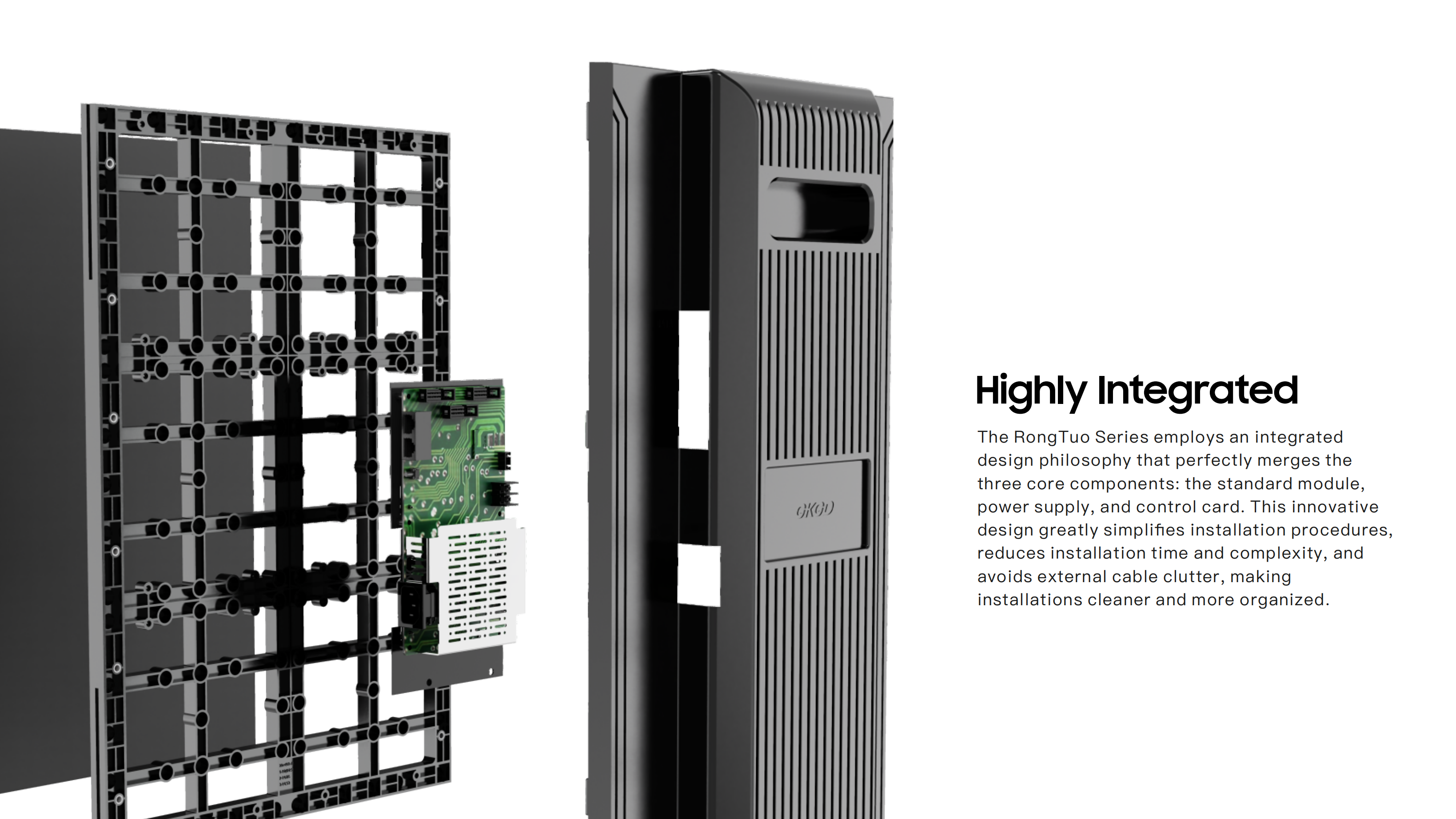 The RongTuo Series adopts an advanced integrated design concept, seamlessly combining three core components: standard modules, power supplies, and control cards. This innovation significantly simplifies the installation process, reduces time and complexity, and eliminates issues caused by external cable stacking.